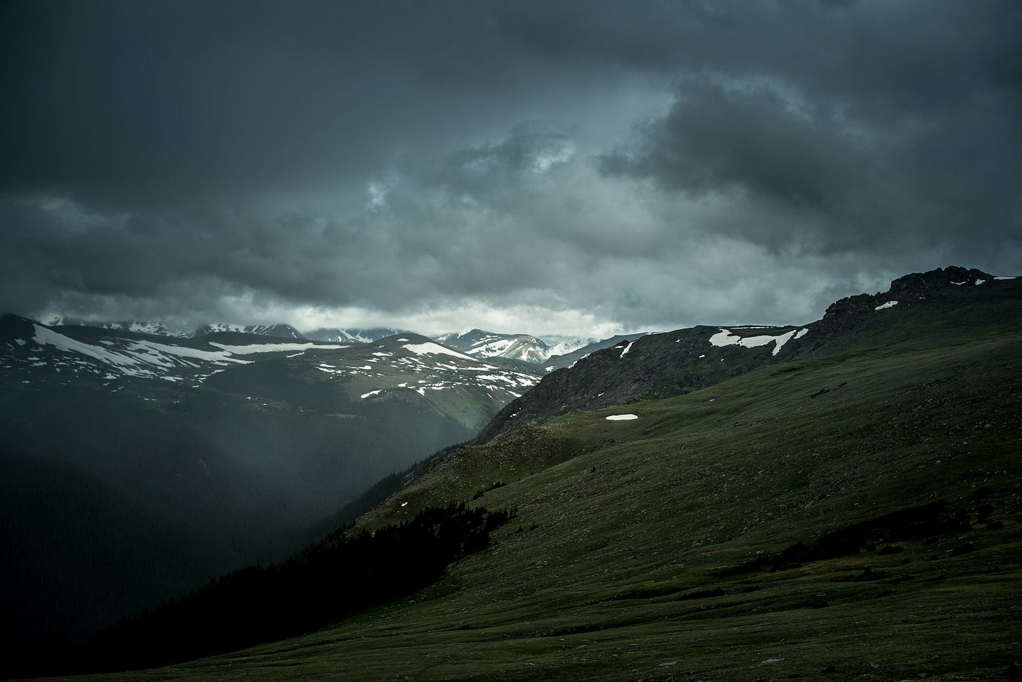 (snow capped, green mountains in the foreground and midground frame the top of a valley with low grey clouds in the sky)